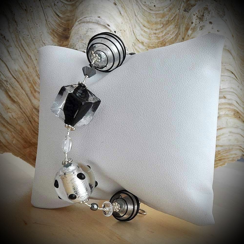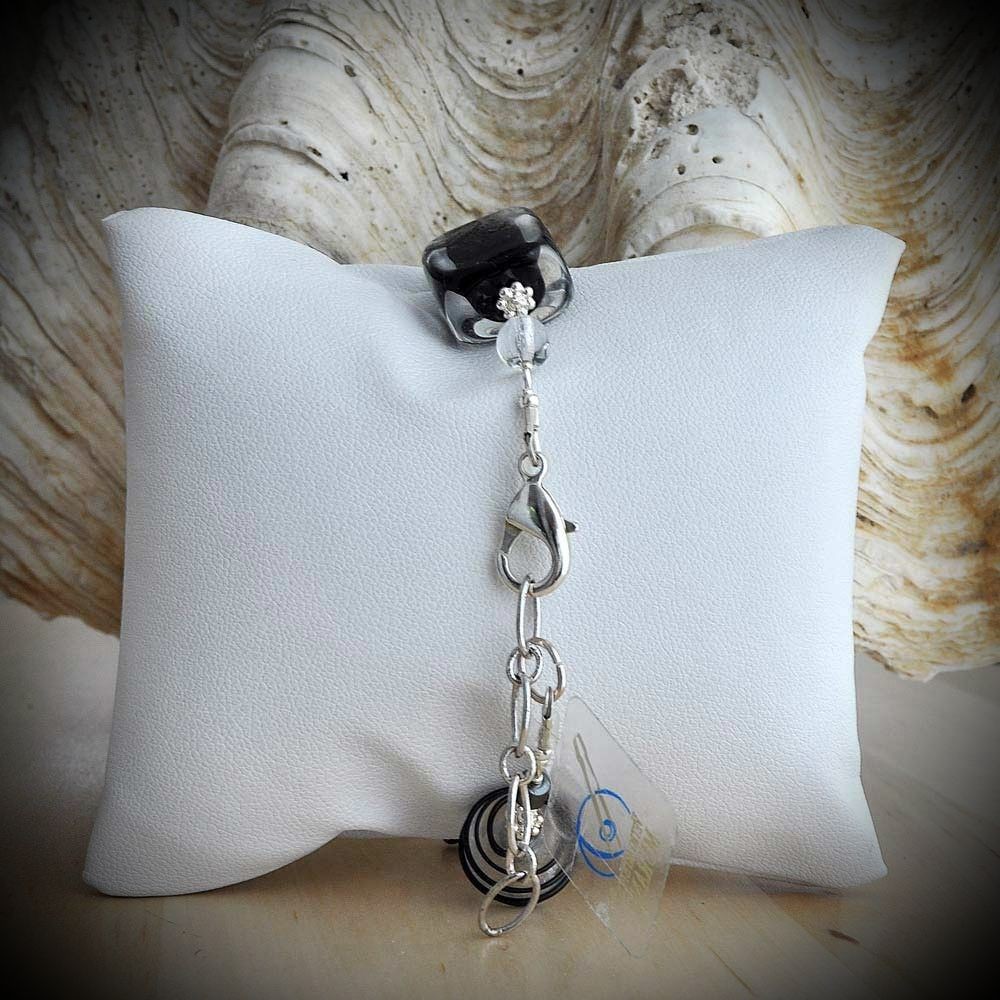 Das Armband besteht aus handgefertigten Perlen aus Murano-Glas, die über der Flamme geformt wurden. Runde schwarze Perlen und Würfel enthalten Einschlüsse aus Silberfolie, die bei jeder Bewegung dezent aufleuchten.