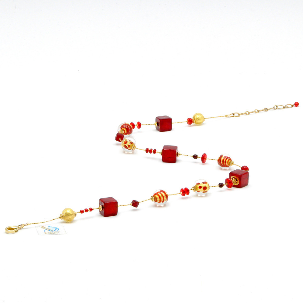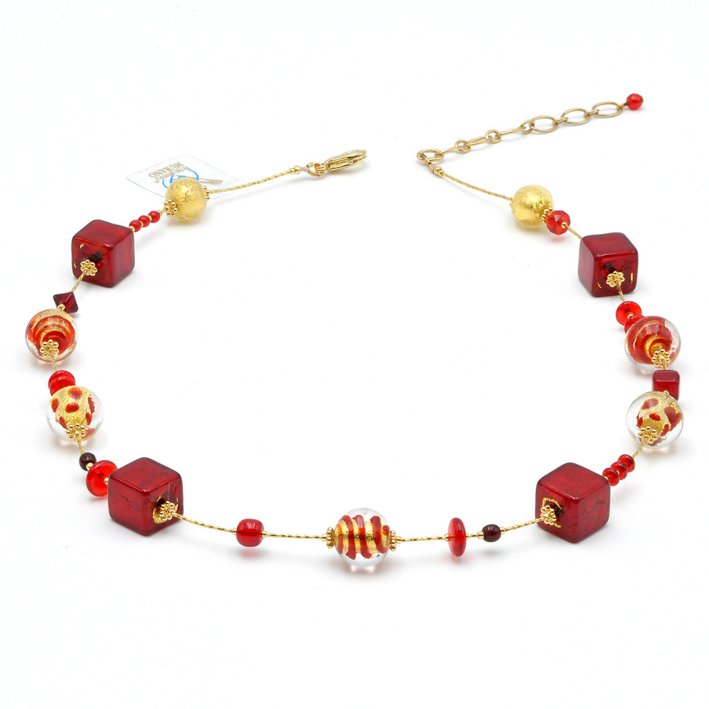 La collana Biz rossa è composta da perle rotonde in vero vetro di Murano, ognuna con un magnifico vortice rosso attorno a un'inclusione di foglia d'oro, creando un effetto visivo unico e affascinante.